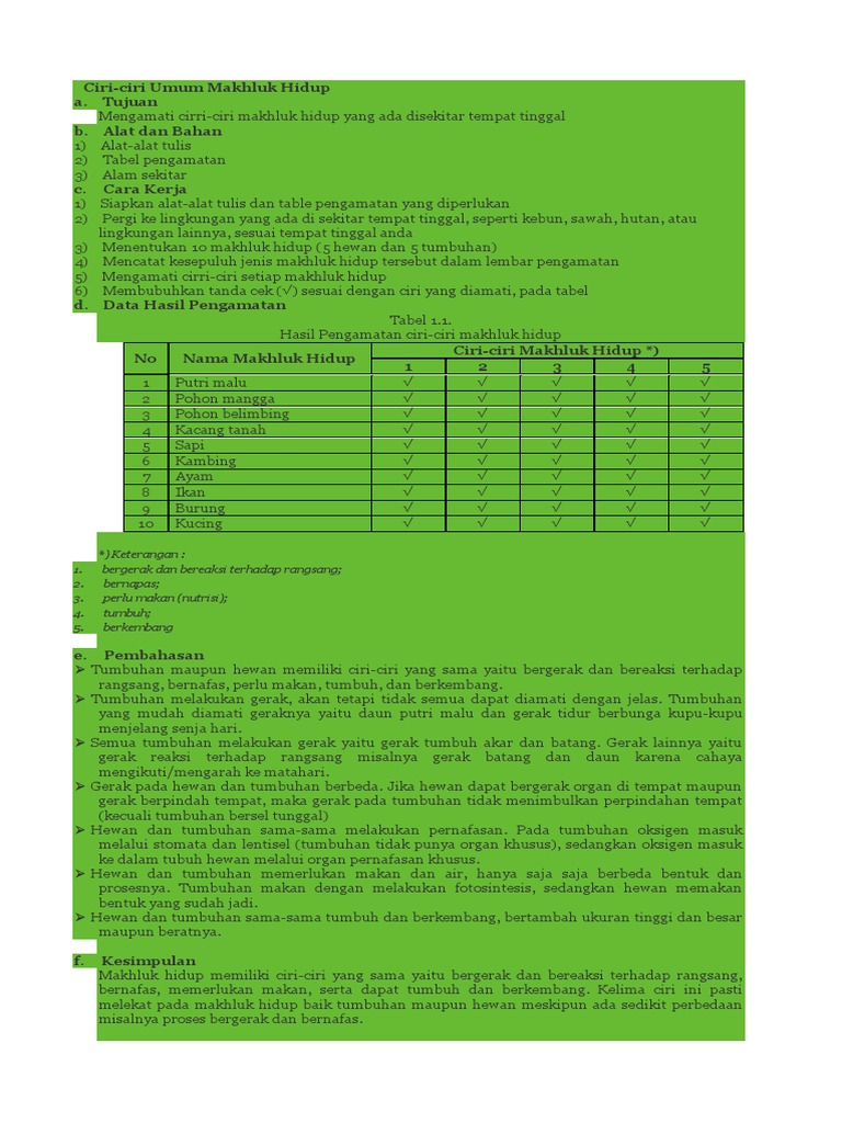 Ciri Ciri Umum Makhluk Hidup A Tujuan B Alat Dan Bahan