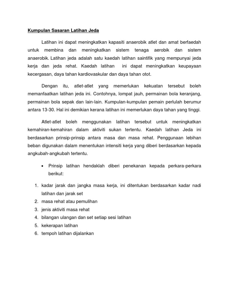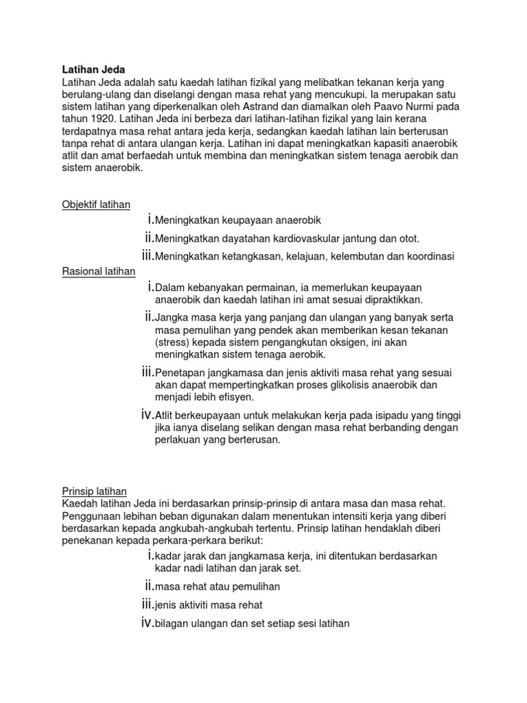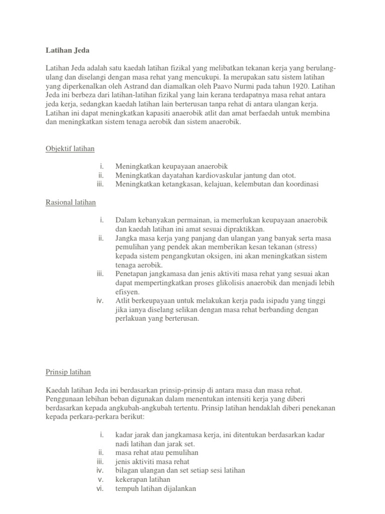 Prinsip latihan jeda. 8 2 3 prinsip latihan jeda. Prinsip latihan hendaklah diberi penekanan kepada perkara perkara berikut. Masa kerja berkadar dengan masa rehat bagi jeda jarak jauh kadar kerja. Antara kaedah latihan terbaik sesuai bagi kebanyakan sukan seperti bola sepak hoki ragbi dan permainan padang lain.