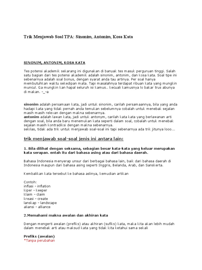 Contoh Soal Psikotes Sinonim Dan Antonim Dan Jawabannya Pdf